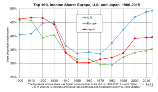 在最新出版的《資本與意識形態(tài)》一書中,法國著名經(jīng)濟學家托馬斯·皮凱蒂描繪了前10%的高收入占比變動情況。