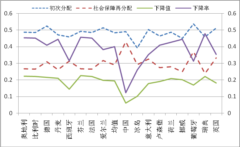 2013年,18個歐盟國家市場收入的基尼系數(shù)為0.443,但是,在社會保障的作用下,這些國家的可支配收入基尼系數(shù)降為0.29,遠低于中國的0.469。從下降幅度來看,歐盟國家政府的社會保障政策使得其基尼系數(shù)的平均值下降了40%,相比之下,中國僅下降了12.3%。