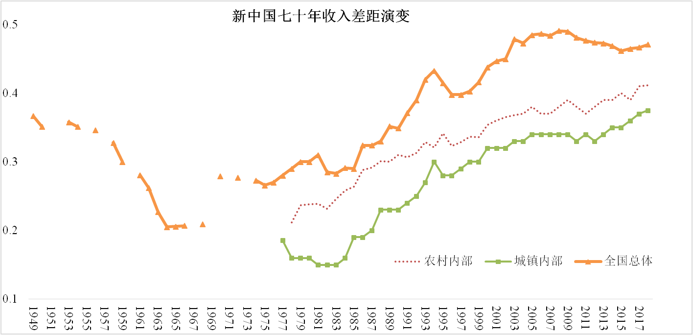 資料來源:全國基尼系數(shù)來自于世界銀行(1981-2001),收入分配課題組(2002)和國家統(tǒng)計局(2003-2017)的估計結(jié)果。農(nóng)村和城鎮(zhèn)的基尼系數(shù)來自于歷年的“中國居民收入分配年度報告”。2012-2017年農(nóng)村及2011-2017年城鎮(zhèn)內(nèi)部數(shù)據(jù)來自于省份加權計算結(jié)果。1978-1980年全國基尼系數(shù)來自于省份加權并調(diào)整的結(jié)果。1949-1977年全國總體、城鎮(zhèn)內(nèi)部、農(nóng)村內(nèi)部差距,都來自于UNU-WIDER數(shù)據(jù)庫。