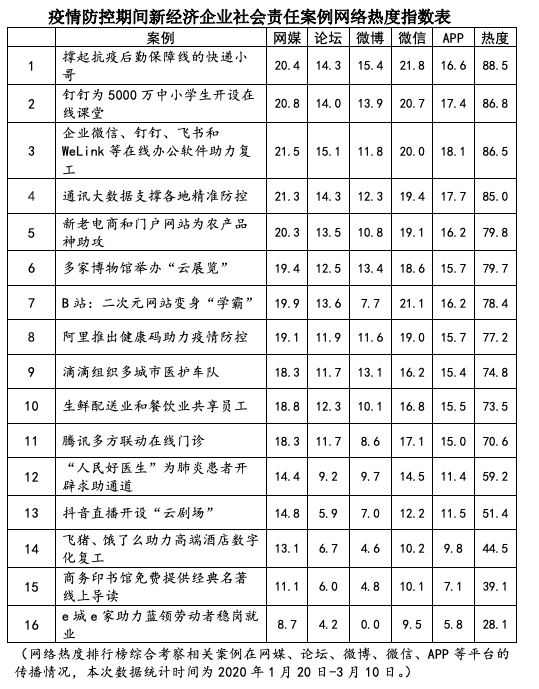 人民網(wǎng)3月13日電(劉志華) 今日,中國經(jīng)濟體制改革研究會互聯(lián)網(wǎng)與新經(jīng)濟專業(yè)委員會、人民網(wǎng)輿論與公共政策研究中心聯(lián)合發(fā)布《疫情防控期間新經(jīng)濟企業(yè)社會責(zé)任案例》報告。該報告由人民網(wǎng)輿論與公共政策研究中心、中國經(jīng)濟體制改革研究會互聯(lián)網(wǎng)與新經(jīng)濟專業(yè)委員會共同組建的“新經(jīng)濟指數(shù)課題組”推出。據(jù)了解,課題組后續(xù)還將持續(xù)發(fā)布新經(jīng)濟企業(yè)社會責(zé)任指數(shù)及推薦案例。