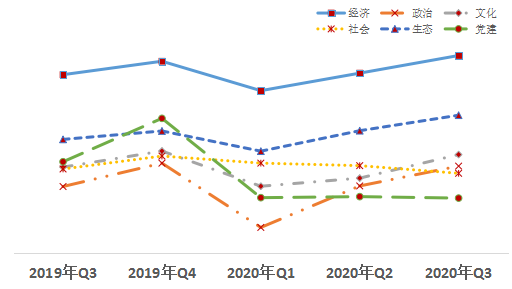 除社會(huì)、黨建領(lǐng)域外,其他領(lǐng)域熱度值均比上一季度有所提升。其中政治領(lǐng)域改革熱度值超越社會(huì)領(lǐng)域,持續(xù)呈反彈上升趨勢;文化領(lǐng)域改革熱度值升幅高于政治、經(jīng)濟(jì)等領(lǐng)域。