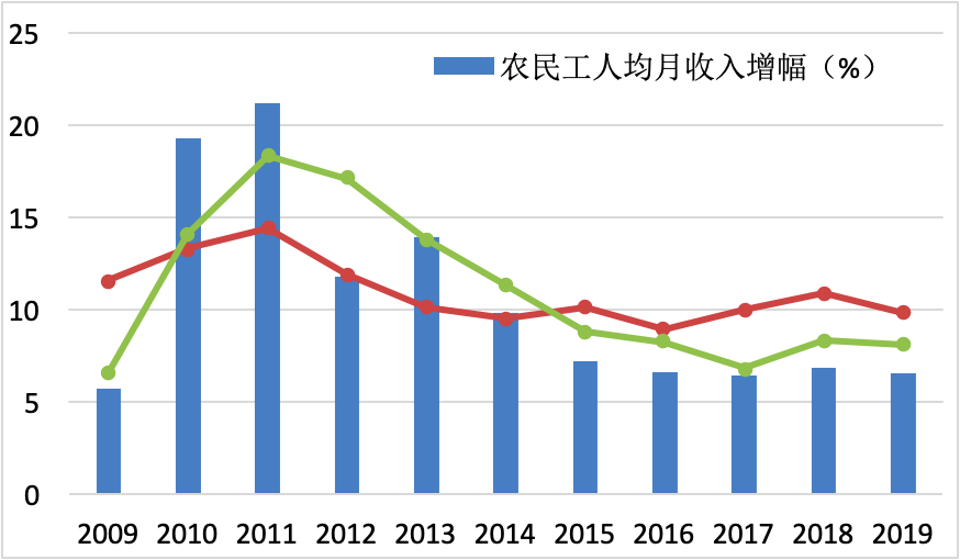 農(nóng)民工工資在2010年前后曾有過(guò)較快的提高,主要得益于各地最低工資的調(diào)整。值得注意的是,農(nóng)民工工資收入相對(duì)增速2015年后開(kāi)始下降。農(nóng)民工年平均收入2017年是城鎮(zhèn)非私營(yíng)單位職工平均收入的56%,2019年下降為52.5%。