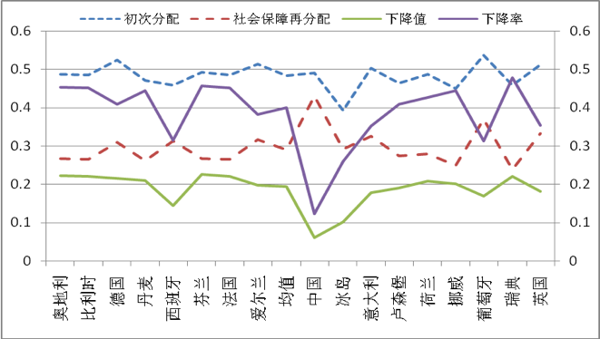 我國(guó)社會(huì)保障制度在平抑一次分配差距方面還遠(yuǎn)沒(méi)有發(fā)揮應(yīng)有的作用。據(jù)北師大收入分配研究院2017年的一項(xiàng)研究,18個(gè)歐盟國(guó)家市場(chǎng)收入的基尼系數(shù)為0.443,在社會(huì)保障的作用下,這些國(guó)家的可支配收入基尼系數(shù)降為0.29。從下降幅度來(lái)看,歐盟國(guó)家政府的社會(huì)保障政策使得其基尼系數(shù)的平均值下降了40%,相比之下,中國(guó)僅下降了12.3%。