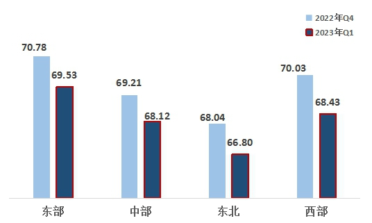2、中部地區(qū)落后于西部地區(qū)。東部、西部、中部、東北地區(qū)指數(shù)分別為69.53、68.43、68.12、66.80。東部地區(qū)領先,西部地區(qū)排名第二,連續(xù)四個季度超越中部地區(qū),東北地區(qū)最后。與上一季度相比,四大區(qū)域均有下滑,東北地區(qū)降幅較大。