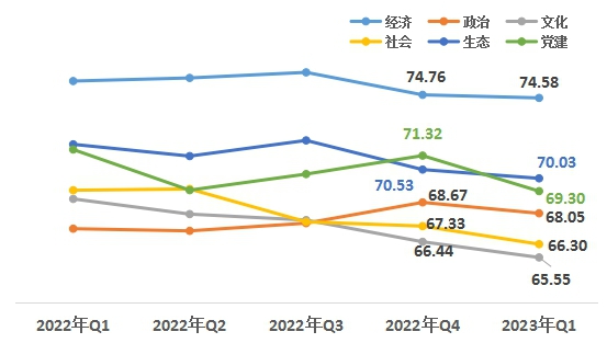 1、經(jīng)濟、生態(tài)領域小幅下降。從六大領域來看,經(jīng)濟領域74.58,政治領域68.05,文化領域65.55,社會領域66.30,生態(tài)領域70.03,黨建領域69.30。與上一季度相比,六大領域均有小幅下降;與去年一季度相比,政治領域同比上升,其他領域同比小幅下降。
