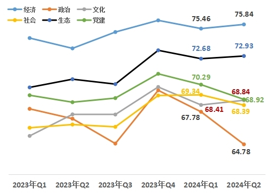 從改革熱度指數(shù)的六大領(lǐng)域來看,經(jīng)濟(jì)領(lǐng)域75.84,政治領(lǐng)域64.78,文化領(lǐng)域68.84,社會(huì)領(lǐng)域68.39,生態(tài)領(lǐng)域72.93,黨建領(lǐng)域68.92。與上一季度相比,經(jīng)濟(jì)、文化、生態(tài)領(lǐng)域小幅上升。同比來看,經(jīng)濟(jì)、文化、社會(huì)、生態(tài)、黨建領(lǐng)域的改革熱度均呈現(xiàn)上升趨勢(shì)。