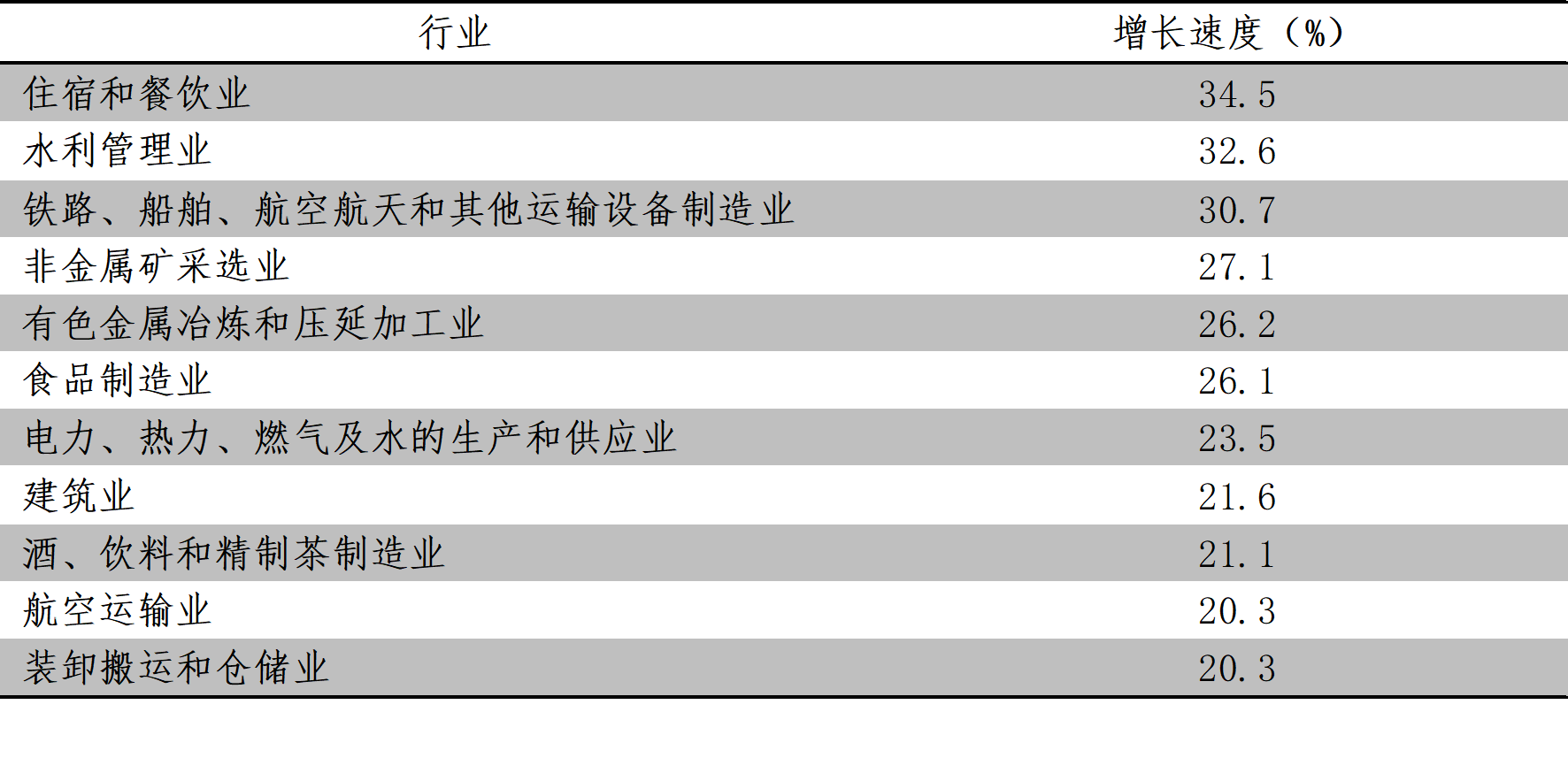1-8月份,固定資產投資增速超過20%的行業(yè)共11個,即住宿和餐飲業(yè)增長34.5%,水利管理業(yè)增長32.6%,鐵路、船舶、航空航天和其他運輸設備制造業(yè)增長30.7%,非金屬礦采選業(yè)增長27.1%,有色金屬冶煉和壓延加工業(yè)增長26.2%,食品制造業(yè)增長26.1%,電力、熱力、燃氣及水的生產和供應業(yè)增長23.5%,建筑業(yè)增長21.6%,酒、飲料和精制茶制造業(yè)增長21.1%,航空運輸業(yè)增長20.3%,裝卸搬運和倉儲業(yè)增長20.3%。