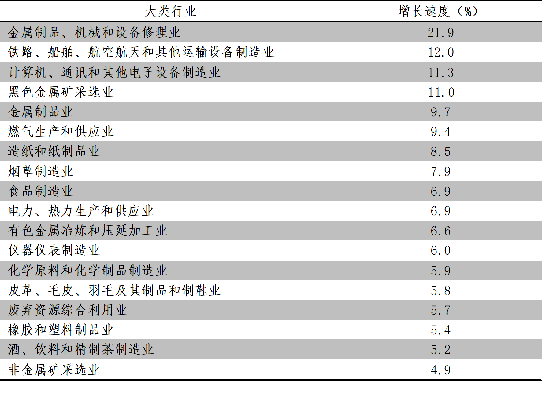 8月份,增長速度超過規(guī)模以上工業(yè)增長4.5%的主要大類行業(yè)共有18個,即金屬制品、機械和設備修理業(yè)同比增長21.9%,鐵路、船舶、航空航天和其他運輸設備制造業(yè)增長12.0%,計算機、通訊和其他電子設備制造業(yè)增長11.3%,黑色金屬礦采選業(yè)增長11.0%,金屬制品業(yè)增長9.7%,燃氣生產和供應業(yè)增長9.4%,造紙和紙制品業(yè)增長8.5%,煙草制造業(yè)增長7.9%,食品制造業(yè)增長6.9%,電力、熱力生產和供應業(yè)增長6.9%,有色金屬冶煉和壓延加工業(yè)增長6.6%,儀器儀表制造業(yè)增長6.0%,化學原料和化學制品制造業(yè)增長5.9%,皮革、毛皮、羽毛及其制品和制鞋業(yè)增長5.8%,廢棄資源綜合利用業(yè)增長5.7%,橡膠和塑料制品業(yè)增長5.4%,酒飲料和精制茶制造業(yè)增長百分之5.2%,非金屬礦采選業(yè)增長4.9%。