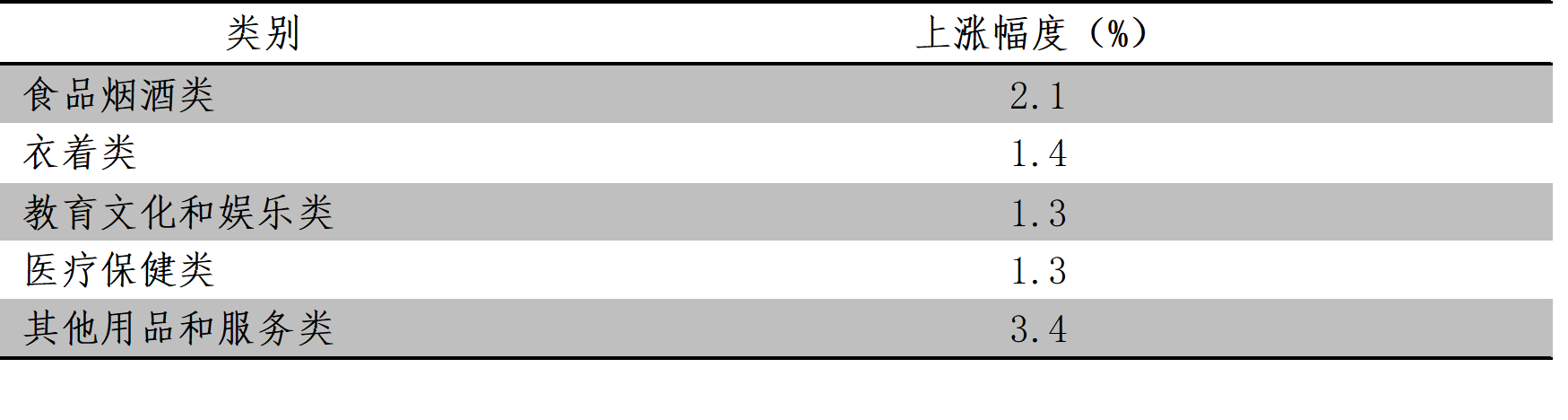 漲幅超過CPI同比上漲0.6%的類別共有5類,即食品煙酒類價格同比上漲2.1%,衣著類上漲1.4%,教育文化和娛樂類上漲1.3%,醫(yī)療保健類上漲1.3%,其他用品和服務類上漲3.4%。