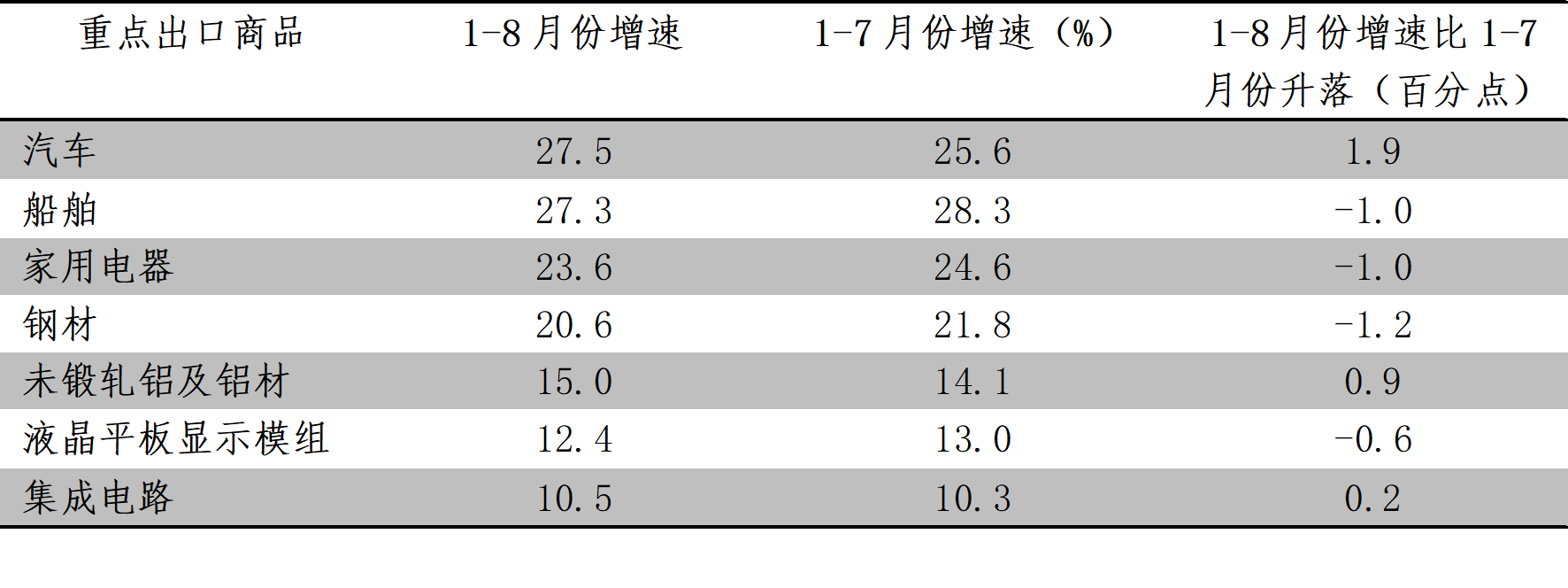 1-8月份,累計出口數量增長速度超過10%的重點商品共有7類,與1-7月份持平,其中3類增速回升,4類增速回落,即汽車出口增長27.5%,船舶出口增長27.3%,家用電器出口增長23.6%,鋼材出口增長20.6%,未鍛軋鋁及鋁材出口增長15.0%,液晶平板顯示模組出口增長12.4%,集成電路出口增長10.5%。