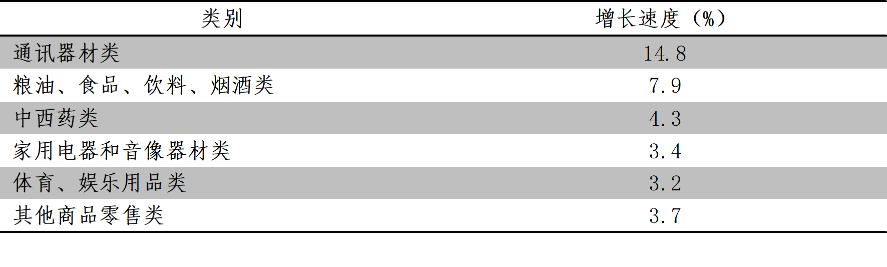 8月份,限額以上單位商品零售額增速快于消費品零售總額2.1%增速的共有6類,即通訊器材類同比增長14.8%,糧油、食品、飲料、煙酒類增長7.9%,中西藥類增長4.3%,家用電器和音響汽車類增長3.4%,體育、娛樂用品類增長3.2%,其他商品零售類增長3.7%。