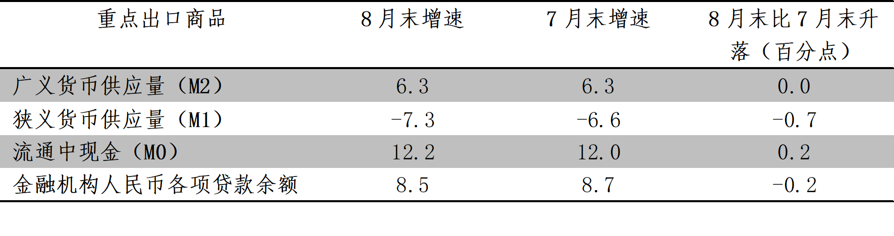 表3. 8月末和7月末主要金融貨幣指標同比增速(%)