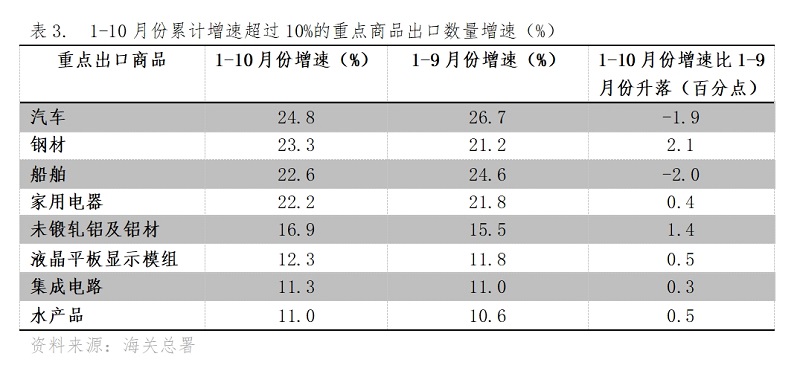 1-10月份,累計出口數(shù)量增長速度超過10%的重點商品共有8類,與1-9月份持平,其中6類增速回升,2類增速回落,即汽車出口增長24.8%,鋼材出口增長23.3%,船舶出口增長22.6%,家用電器出口增長22.2%,未鍛軋鋁及鋁材出口增長16.9%,液晶平板顯示模組出口增長12.3%,集成電路出口增長11.3%,水產(chǎn)品出口增長11.0%。