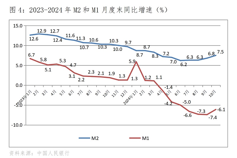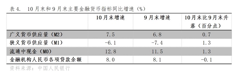 (四)M2增速持續(xù)回升。10月末,廣義貨幣供應量(M2)同比增長7.5%,比9月末增長6.8%回升0.7個百分點,9月末增速比8月末增速回升了0.5個百分點;狹義貨幣供應量(M1)降幅由擴大轉(zhuǎn)為縮小,10月末同比下降6.1%,比9月末下降7.4%縮小1.3個百分點,而9月末降幅比8月末降幅擴大0.1個百分點,扭轉(zhuǎn)了自5月末以來降幅逐月擴大的趨勢;流通中貨幣(M0)增速由落轉(zhuǎn)升,10月末同比增長12.8%,比9月末增長11.5%回升了1.3個百分點,而9月末增速比8月末增速回落了0.7個百分點。貨幣供應量增速的回升或降幅的縮小,對經(jīng)濟回升將發(fā)揮著積極的重要作用。