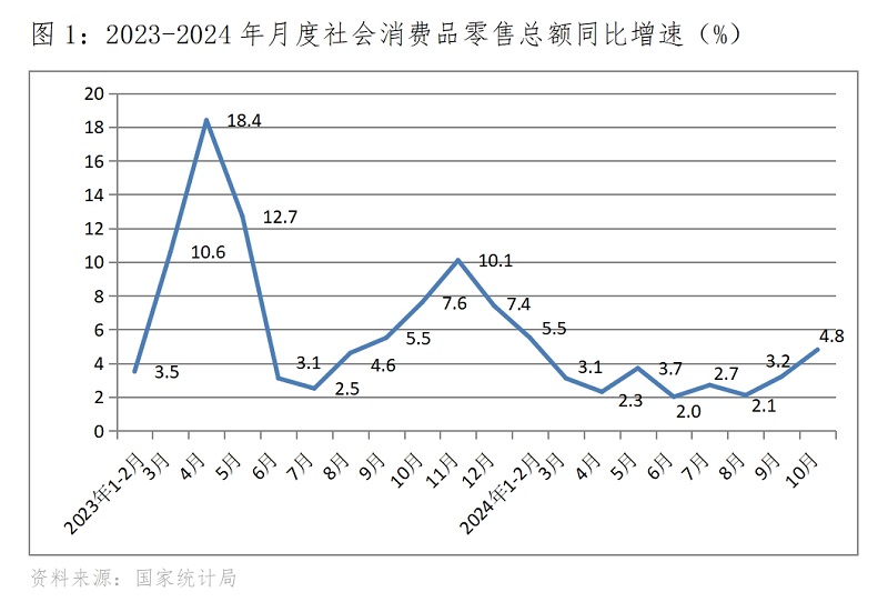 (一)零售增速繼續(xù)回升。10月份,社會消費品零售總額同比增長4.8%,比9月份增長3.2%回升了1.6個百分點,9月份比8月份增長2.1%回升了1.1個百分點。社會消費品零售總額增速的持續(xù)回升,既反映了政策措施取得了積極效果,也說明消費者對有效政策措施的響應較為積極。隨著消費品以舊換新政策措施力度的不斷加大,家用電器和音像器材以及汽車零售額增長加快或由負轉(zhuǎn)正,10月份限額以上企業(yè)家用電器和音像器材零售額增長39.2%,比9月份加快17.7個百分點,9月份比8月份加快17.1個百分點;汽車零售額增長3.7%,比9月份加快3.3個百分點,9月份為增長0.4%,8月份為下降7.3%。可見,實施有效的政策措施對擴大消費的效果是明顯的積極的。