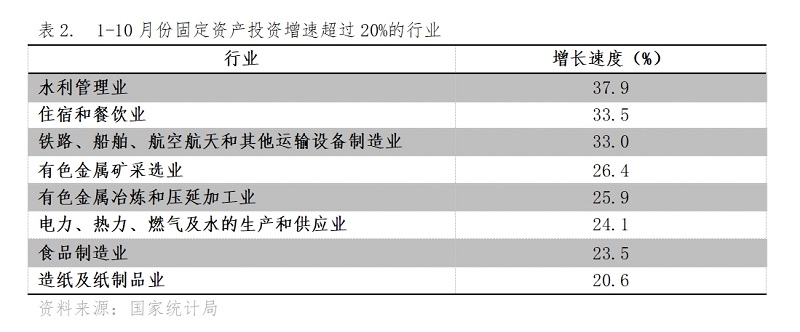 1-10月份,固定資產(chǎn)投資增速超過20%的行業(yè)共8個,即水利管理業(yè)增長37.9%,住宿和餐飲業(yè)增長33.5%,鐵路、船舶、航空航天和其他運輸設(shè)備制造業(yè)增長33.0%,有色金屬礦采選業(yè)增長26.4%,有色金屬冶煉和壓延加工業(yè)增長25.9%,電力、熱力、燃氣及水的生產(chǎn)和供應業(yè)增長24.1%,食品制造業(yè)增長23.5%,造紙及紙制品業(yè)增長20.6%。