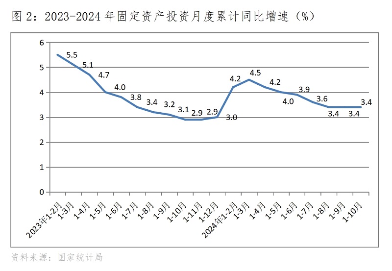 (二)投資增速持續(xù)持平。1-10月份,固定資產(chǎn)投資同比增長3.4%,與1-9月份增長3.4%持平,1-8月份也是增長3.4%,投資增速扭轉(zhuǎn)了此前連續(xù)5個月的回落,保持了連續(xù)3個月的持平。國有控股投資增速略有回升,1-10月份比1-9月份回升0.1個百分點;民間投資降幅略有擴大,1-10月份比1-9月份擴大0.1個百分點。三次產(chǎn)業(yè)投資中,第一產(chǎn)業(yè)投資增速回升0.2個百分點,第二產(chǎn)業(yè)投資增速回落0.1個百分點,第三產(chǎn)業(yè)投資降幅擴大0.2個百分點。