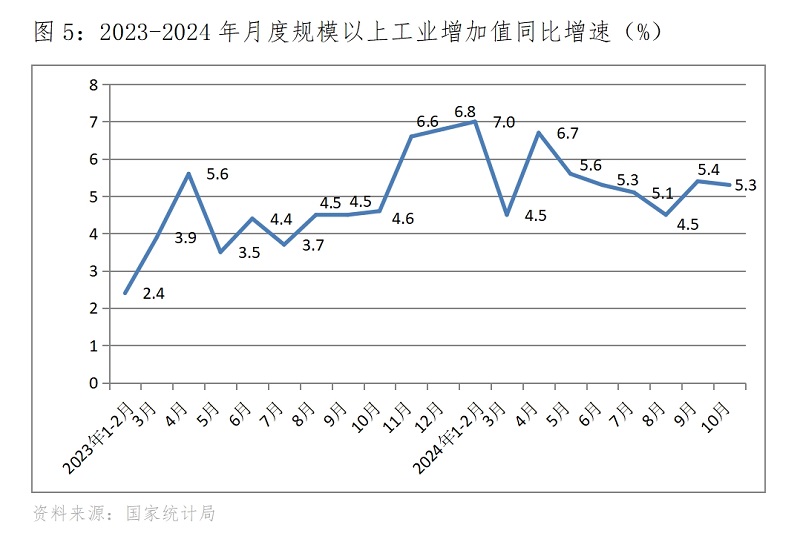 (一)工業(yè)增速由升轉(zhuǎn)落。10月份,規(guī)模以上工業(yè)增加值同比增長5.3%,比9月份增長5.4%回落了0.1個百分點,9月份比8月份回升了0.9個百分點。10月份工業(yè)增速回落,雖然幅度不大,但這是在9月份回升后的回落,也是在上年同期基數(shù)并不高的基礎(chǔ)上的回落,而且還是在政策措施力度不斷加大下的回落,充分說明工業(yè)回升仍面臨著較大的壓力。