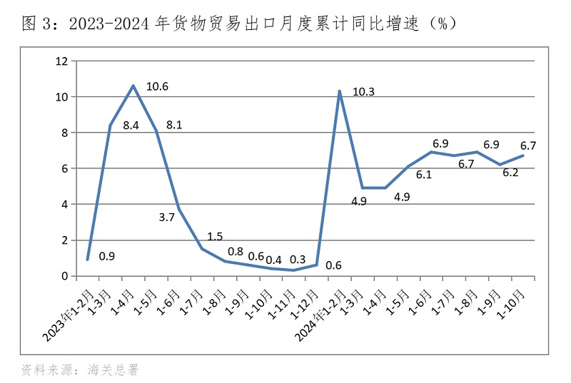 (三)貨物出口增速由落轉(zhuǎn)升。1-10月份,貨物出口同比增長6.7%,比1-9月份增長6.2%回升0.5個百分點,1-9月份比1-8月份回落0.7個百分點,呈現(xiàn)出增速由降轉(zhuǎn)升的態(tài)勢。貨物出口對主要貿(mào)易出口經(jīng)濟體增速全面回升,1-10月份對歐盟出口增長3.5%,比1-9月份回升0.8個百分點;對美國出口增長4.9%,比1-9月份回升0.3個百分點;對東盟出口增長12.5%,比1-9月份回升0.2個百分點;對拉丁美洲出口增長14.5%,比1-9月份回升0.8個百分點。