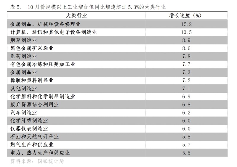 10月份,增長速度超過規(guī)模以上工業(yè)增長5.3%的主要大類行業(yè)共有17個,即金屬制品、機械和設(shè)備修理業(yè)同比增長15.2%,計算機、通訊和其他電子設(shè)備制造業(yè)增長10.5%,煙草制造業(yè)增長8.9%,黑色金屬礦采選業(yè)增長8.6%,醫(yī)藥制造業(yè)增長7.8%,有色金屬冶煉和壓延加工業(yè)增長7.7%,金屬制品業(yè)增長7.3%,橡膠和塑料制品業(yè)增長7.2%,其他制造業(yè)增長7.1%,化學原料和化學制品制造業(yè)增長6.9%,廢棄資源綜合利用業(yè)增長6.8%,汽車制造業(yè)增長6.2%,化學纖維制造業(yè)增長6.0%,儀器儀表制造業(yè)增長6.0%,石油和天然氣開采業(yè)增長5.8%,燃氣生產(chǎn)和供應業(yè)增長5.7%,電力、熱力生產(chǎn)和供應業(yè)增長5.5%。
