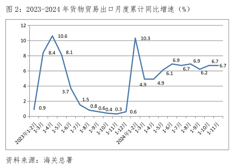 (二)貨物出口增速由升轉(zhuǎn)平。1-11月份,貨物出口同比增長6.7%,與1-10月份增速持平,1-10月份增速比1-9月份增速6.2%回升0.5個(gè)百分點(diǎn)。對歐盟、美國和東盟等貨物出口增速全面回升,1-11月份對歐盟出口增長3.8%,比1-10月份回升0.3個(gè)百分點(diǎn);對美國出口增長5.1%,比1-10月份回升0.2個(gè)百分點(diǎn);對東盟出口增長12.7%,比1-10月份回升0.2個(gè)百分點(diǎn);但對拉丁美洲出口增長14.1%,比1-10月份回落0.4個(gè)百分點(diǎn)。