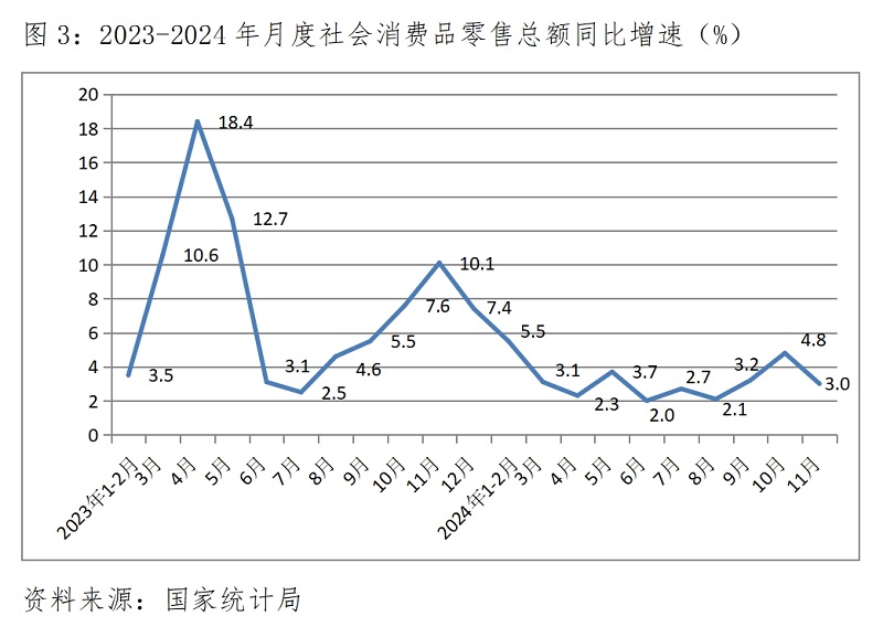 (一)零售增速由升轉(zhuǎn)落。11月份,社會(huì)消費(fèi)品零售總額同比增長3.0%,比10月份增長4.8%回落1.8個(gè)百分點(diǎn),而10月份增速比9月份增速3.2%回升了1.6個(gè)百分點(diǎn)。但受消費(fèi)品以舊換新政策措施的持續(xù)作用,家用電器和音像器材和汽車銷售仍保持較快增長,11月份限額以上企業(yè)家用電器和音像器材零售額繼續(xù)保持調(diào)整增長22.2%,已連續(xù)3個(gè)月保持兩位數(shù)增長;汽車零售額增長6.6%,比上月回升2.9個(gè)百分點(diǎn),10月份比9月份回升3.3個(gè)百分點(diǎn),已連續(xù)兩個(gè)月以大約3.0個(gè)百分點(diǎn)回升。