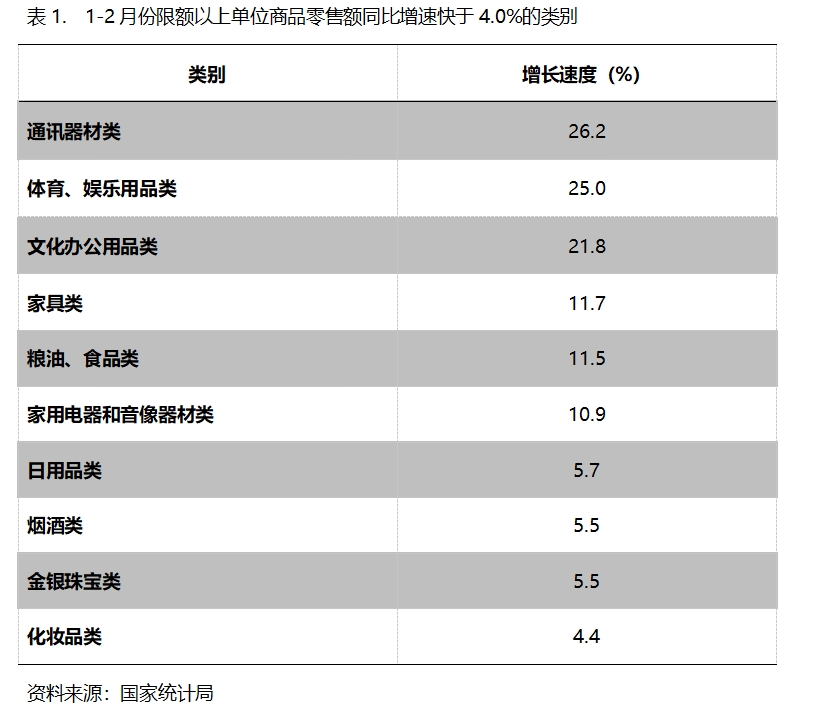 1-2月份,限額以上單位商品零售額增速快于社會(huì)消費(fèi)品零售總額4.0%增速的共有10類,即通訊器材類增長26.2%,體育、娛樂用品類增長25.0%,文化辦公用品類增長21.8%,家具類增長11.7%,糧油、食品類增長11.5%,家用電器和音像器材類增長10.9%,日用品類增長5.7%,煙酒類增長5.5%,金銀珠寶類增長5.5%,化妝品類同比增長4.4%。