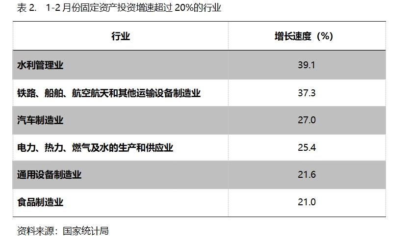 1-2月份,固定資產(chǎn)投資增速超過20%的主要行業(yè)共6個(gè),即水利管理業(yè)增長39.1%,鐵路、船舶、航空航天和其他運(yùn)輸設(shè)備制造業(yè)增長37.3%,汽車制造業(yè)增長27.0%,電力、熱力、燃?xì)饧八纳a(chǎn)和供應(yīng)業(yè)增長25.4%,通用設(shè)備制造業(yè)增長21.6%,食品制造業(yè)增長21.0%。