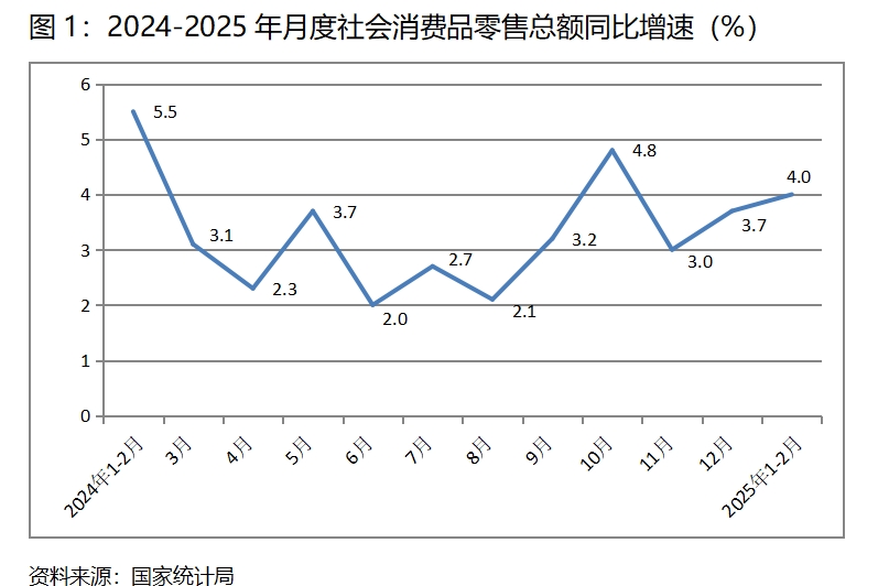 (一)零售增速繼續(xù)回升。1-2月份,社會(huì)消費(fèi)品零售總額同比增長4.0%,比上年12月份增長3.7%回升了0.3個(gè)百分點(diǎn),上年12月份比上年11月份增長3.0%回升了0.7個(gè)百分點(diǎn)。數(shù)據(jù)顯示,社會(huì)消費(fèi)品零售總額保持了持續(xù)回升的勢頭,這是上年以來采取的以舊換新等系列促進(jìn)消費(fèi)政策措施的結(jié)果,特別需要指出的是,這一增速是在上年同期基數(shù)較高基礎(chǔ)上的回升,更加說明消費(fèi)增長的動(dòng)力在增強(qiáng)。