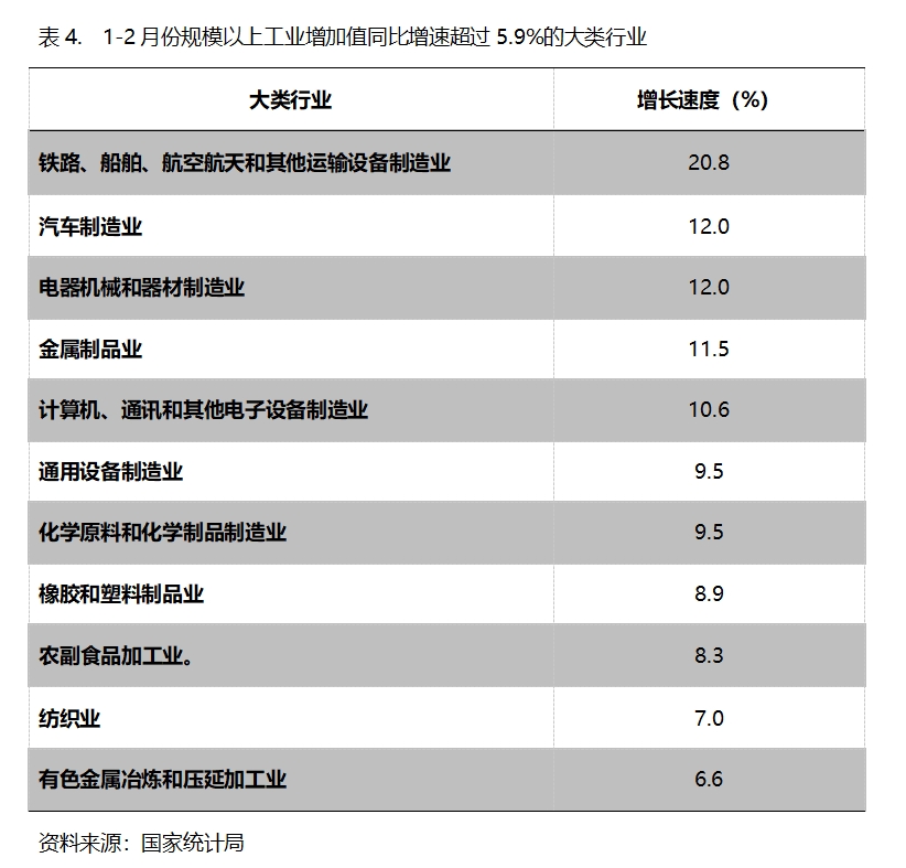 1-2月份,增長速度超過規(guī)模以上工業(yè)增長5.9%的主要大類行業(yè)共有11個(gè),即鐵路、船舶、航空航天和其他運(yùn)輸設(shè)備制造業(yè)增長20.8%,汽車制造業(yè)增長12.0%,電器機(jī)械和器材制造業(yè)增長12.0%,金屬制品業(yè)增長11.5%,計(jì)算機(jī)、通訊和其他電子設(shè)備制造業(yè)增長10.6%,通用設(shè)備制造業(yè)增長9.5%,化學(xué)原料和化學(xué)制品制造業(yè)增長9.5%,橡膠和塑料制品業(yè)增長8.9%,農(nóng)副食品加工業(yè)增長8.3%,紡織業(yè)增長7.0%,有色金屬冶煉和壓延加工業(yè)增長6.6%。
