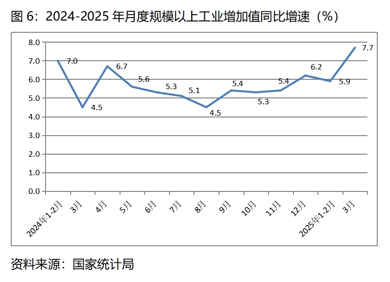 (一)工業(yè)生產(chǎn)增速比上年全年和上年同期均保持回升。一季度規(guī)模以上工業(yè)增加值同比增長6.5%,比上年全年增長5.8%回升0.7個(gè)百分點(diǎn),比上年同期增長6.1%回升0.4個(gè)百分點(diǎn)。其中,3月份規(guī)模以上工業(yè)生產(chǎn)增長7.7%,不僅比1-2月份增速有明顯的回升,而且也是近幾年以來月度規(guī)模以上工業(yè)生產(chǎn)增長最快的一個(gè)月份。