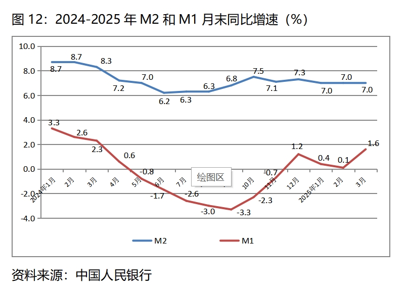 (三)廣義貨幣供應(yīng)量(M2)增速比上年全年和上年同期均保持回落,狹義貨幣供應(yīng)量(M1)增長仍比較緩慢。3月末,廣義貨幣供應(yīng)量同比增長7.0%,比上年年底增長7.3%回落了0.3個(gè)百分點(diǎn),比上年同期增長8.3%回落1.3個(gè)百分點(diǎn),并且已連續(xù)3個(gè)月保持了7.0%的增速;3月末,狹義貨幣供應(yīng)量同比增長1.6%,比上年年底增長1.2%回升了0.4個(gè)百分點(diǎn),比上年同期增長2.3%回落0.7個(gè)百分點(diǎn)。從實(shí)現(xiàn)經(jīng)濟(jì)的穩(wěn)定增長和價(jià)格的合理上漲要求看,貨幣供應(yīng)量增速確實(shí)還是有些緩慢。