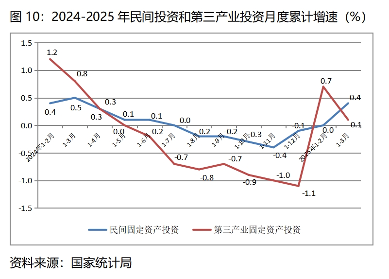 (一)民間投資和第三產(chǎn)業(yè)投資增長仍比較緩慢,增速比上年全年和上年同期均變化不大。一季度民間固定資產(chǎn)投資同比增長0.4%,上年全年為下降0.1%,比上年同期增長0.5%回落0.1個(gè)百分點(diǎn);一季度第三產(chǎn)業(yè)固定資產(chǎn)投資同比增長0.1%,上年全年為下降1.1%,比上年同期增長0.8%回落0.7個(gè)百分點(diǎn)。這說明民營經(jīng)濟(jì)和第三產(chǎn)業(yè)生產(chǎn)經(jīng)營活力還比較弱。
