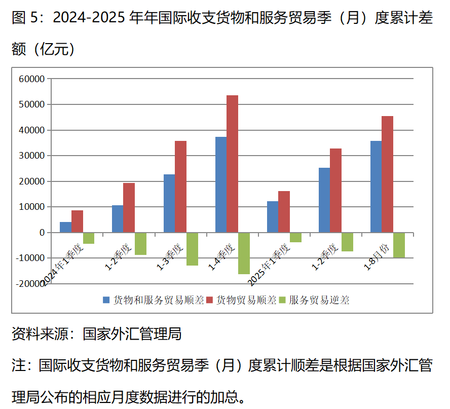 圖5:2024-2025年年國際收支貨物和服務(wù)貿(mào)易季(月)度累計差額(億元)