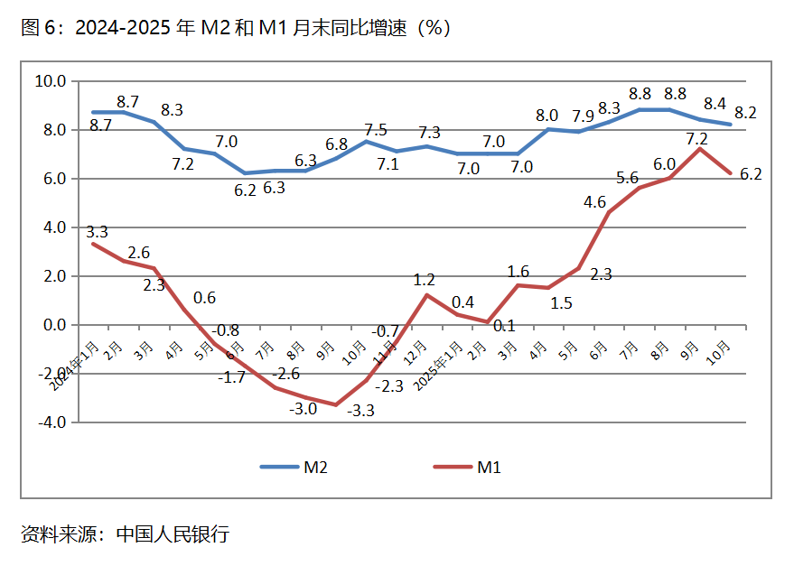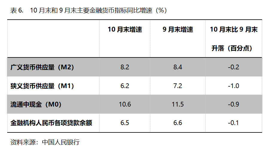 六、M2增速持續(xù)回落。10月末,廣義貨幣供應(yīng)量(M2)同比增長8.2%,比9月末增長8.4%回落0.2個百分點(diǎn),9月末比8月末增長8.8%回落0.4個百分點(diǎn);狹義貨幣供應(yīng)量(M1)同比增長6.2%,比9月末增長7.2%回落1.0個百分點(diǎn),9月末增幅比8月末增長6.0%回升1.2個百分點(diǎn);流通中貨幣(M0)同比增長10.6%,比9月末增長11.5%回落0.9個百分點(diǎn),9月末比8月末增長11.7%回落0.2個百分點(diǎn)。10月份末,M2、M1和M0增速均出現(xiàn)了回落,需要關(guān)注其對經(jīng)濟(jì)運(yùn)行走勢的影響。