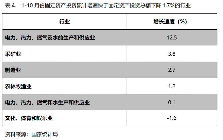 1-10月份,固定資產(chǎn)投資累計增速快于固定資產(chǎn)投資總額下降1.7%的行業(yè)共6個,即電力、熱力、燃?xì)饧八纳a(chǎn)和供應(yīng)業(yè)增長12.5%,采礦業(yè)增長3.8%,制造業(yè)增長2.7%。農(nóng)林牧漁業(yè)增長1.2%,交通運(yùn)輸、倉儲和郵政業(yè)增長0.1%,文化、體育和娛樂業(yè)下降1.6%。