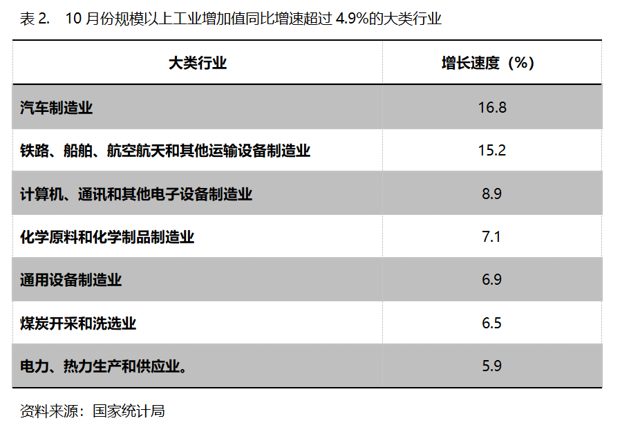 10月份,增長速度超過規(guī)模以上工業(yè)增長4.9%的主要大類行業(yè)共有7個,即汽車制造業(yè)增長16.8%,鐵路、船舶、航空航天和其他運(yùn)輸設(shè)備制造業(yè)同比增長15.2%,計算機(jī)、通訊和其他電子設(shè)備制造業(yè)增長8.9%,化學(xué)原料和化學(xué)制品制造業(yè)增長7.1%,通用設(shè)備制造業(yè)增長6.9%,煤炭開采和洗選業(yè)增長6.5%,電力、熱力生產(chǎn)和供應(yīng)業(yè)增長5.9%。