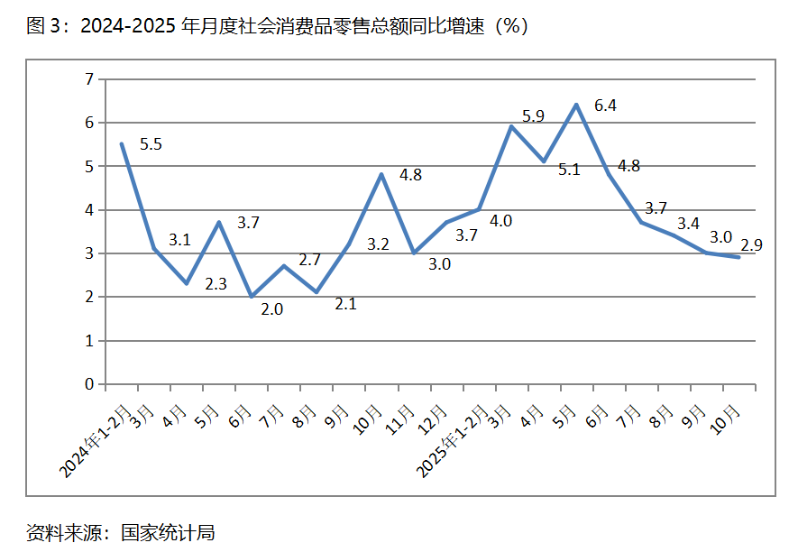 三、零售增速持續(xù)回落。10月份,社會消費(fèi)品零售總額同比增長2.9%,比9月份增長3.0%回落了0.1個百分點(diǎn),9月份比8月份增長3.4%回落了0.4個百分點(diǎn),其中,餐飲收入增速回升,商品零售額增速回落,10月份餐飲收入同比增長3.8%,比9月份增長0.9%回升了2.9個百分點(diǎn);商品零售額增長2.8%,比9月份增長3.3%回落0.5個百分點(diǎn)。10月份社會消費(fèi)品零售總額增速是今年以來月份的最低增速。