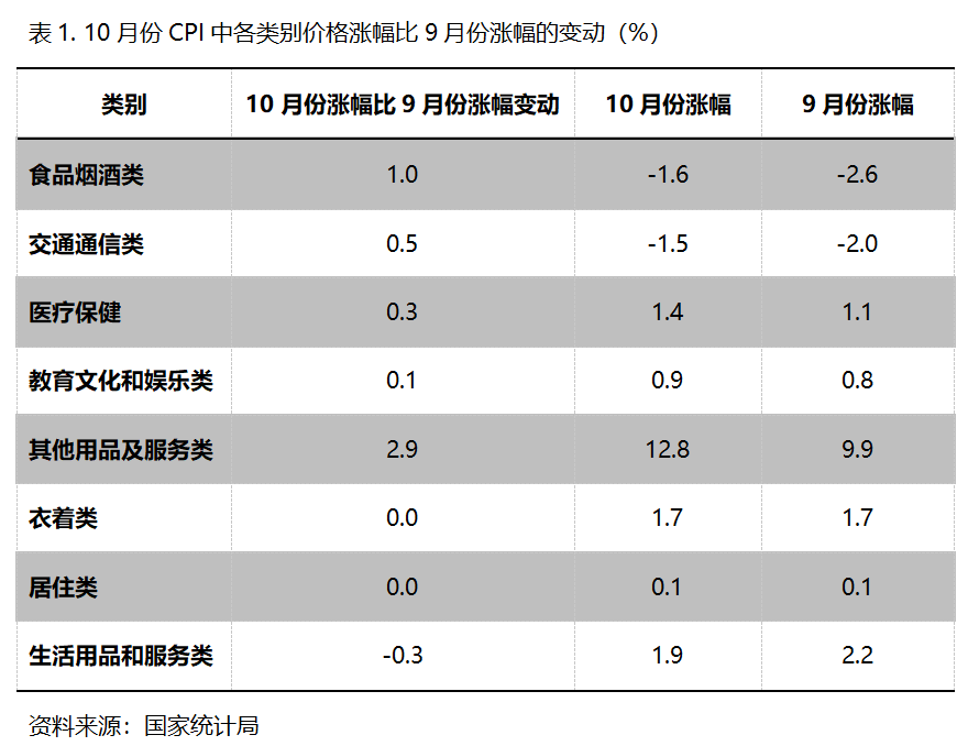 10月份,在CPI 8個類別中有5個類別同比漲幅回升,2個類別持平,1個類別回落。漲幅回升的5個類別包括食品類價格降幅縮小1.0個百分點(diǎn),交通類降幅縮小0.5個百分點(diǎn),醫(yī)療保健類漲幅回升0.3個百分點(diǎn),教育文化和娛樂類漲幅回升0.1個百分點(diǎn),其他用品和服務(wù)類漲幅回升2.9個百分點(diǎn);漲幅持平的2 個類別包括衣著類和居住類;漲幅回落的生活用品及服務(wù)類漲幅回落0.3個百分點(diǎn)。