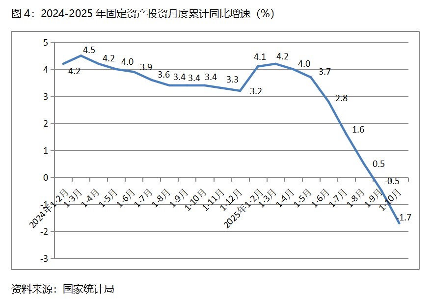 四、投資增速持續(xù)下降。1-10月份,固定資產(chǎn)投資總額同比下降1.7%,比1-9月份下降0.5%擴(kuò)大了1.2個百分點(diǎn),1-9月份增速由1-8月份增長0.5%轉(zhuǎn)為下降0.5%,增速由年初以來的持續(xù)回落轉(zhuǎn)為連續(xù)兩個月的下降。1-10月份國有控股投資同比增長0.1%,比1-9月份增長1.0%回落0.9個百分點(diǎn);民間投資下降4.5%,比1-9月份下降3.1%擴(kuò)大了1.4個百分點(diǎn)。三次產(chǎn)業(yè)投資中,第一產(chǎn)業(yè)投資同比增長2.9%,比1-9月份增長4.6%回落1.7個百分點(diǎn);第二產(chǎn)業(yè)投資增長4.8%,比1-9月份增長6.3%回落1.5個百分點(diǎn);第三產(chǎn)業(yè)投資下降5.3%,比1-9月份下降4.3%擴(kuò)大1.0 百分點(diǎn)。固定資產(chǎn)投資增速自年初以來持續(xù)回落轉(zhuǎn)為近兩個月的持續(xù)下降,呈現(xiàn)出投資后勁乏力的苗頭。