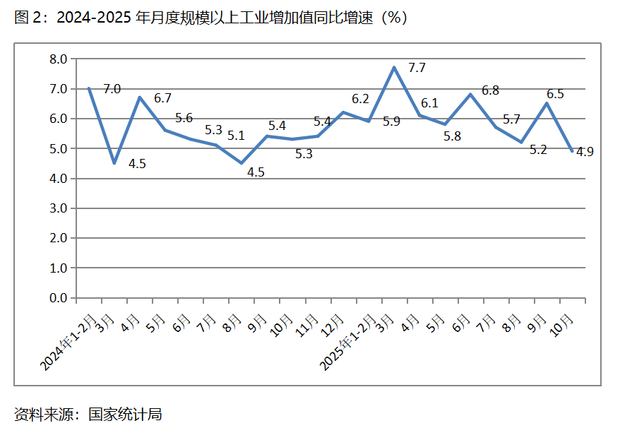 二、工業(yè)增速由升轉(zhuǎn)落。10月份,規(guī)模以上工業(yè)增加值同比增長4.9%,比9月份增長6.5%回落了1.6個百分點(diǎn),9月份比8月份增長5.2%回升了1.3個百分點(diǎn)。從工業(yè)三大門類看,采礦業(yè)和制造業(yè)增速比上月回落,電力、熱力、燃?xì)饧八a(chǎn)和供應(yīng)業(yè)增速回升,10月份,采礦業(yè)同比增長4.5%,比上月增長6.4%回落1.9個百分點(diǎn);制造業(yè)增長4.9%,比上月增長7.3%回落2.4個百分點(diǎn);電力、熱力、燃?xì)饧八a(chǎn)和供應(yīng)業(yè)增長5.4%,比上月增長0.6%回升4.8個百分點(diǎn)。值得關(guān)注的是,10月份工業(yè)增速回落到了今年月份增速的最低點(diǎn)。