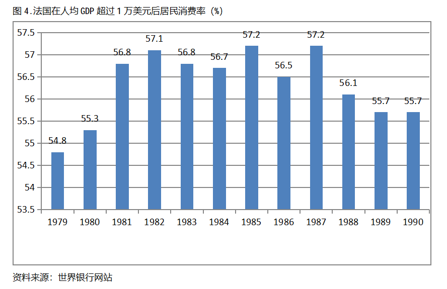 法國在人均GDP超過1萬美元后的12年期間,居民消費(fèi)率一直保持在54.0%以上,同時(shí)也呈現(xiàn)出先提高后回落總體穩(wěn)定的趨勢。法國在1979年人均GDP超過1萬美元,當(dāng)年居民消費(fèi)率為54.8%,1985提高到57.2%,隨后又有所回落,1990年為55.7%,也就是說,法國在人均GDP超過1萬美元后的12年期間,居民消費(fèi)率由當(dāng)年的54.8%提高到1985年最高的57.2%,共提高了2.4個(gè)百分點(diǎn)。