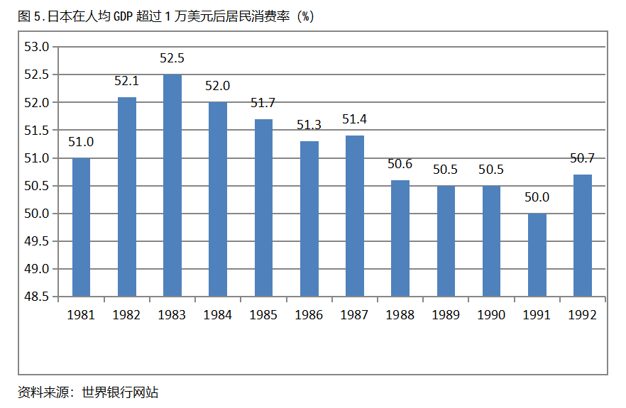 日本在人均GDP超過1萬美元后的12年期間,居民消費(fèi)率一直保持在50.0%以上,同時(shí)也呈現(xiàn)出先提高后回落總體穩(wěn)定的趨勢。日本在1981年人均GDP超過1萬美元,當(dāng)年居民消費(fèi)率為51.0%,1983提高到52.5%,隨后又有所回落,1992年為50.7%,也就是說,日本在人均GDP超過1萬美元后的12年期間,居民消費(fèi)率由當(dāng)年的51.0%提高到1983年最高的52.5%,共提高了1.5個(gè)百分點(diǎn)。