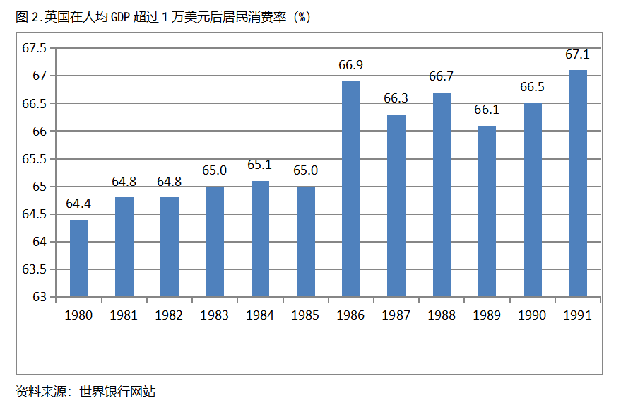 英國在人均GDP超過1萬美元后的12年期間,居民消費(fèi)率一直保持在64.0%以上,同時(shí)也呈現(xiàn)出總體持續(xù)提高的趨勢。英國在1980年人均GDP超過1萬美元,當(dāng)年居民消費(fèi)率為64.4%,此后總體保持了持續(xù)提高的態(tài)勢,12年后的1991年提高到67.1%,提高了2.7個(gè)百分點(diǎn)。