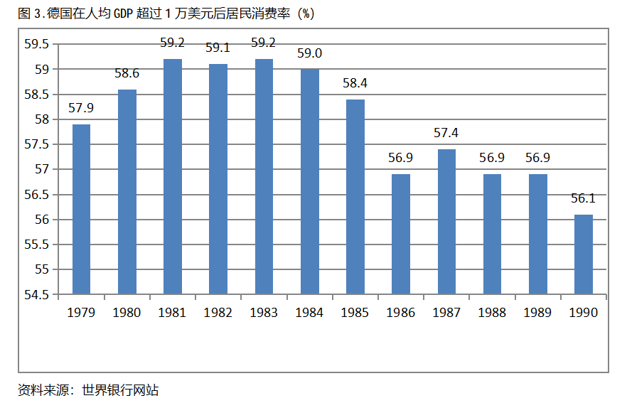 德國在人均GDP超過1萬美元后的12年期間,居民消費(fèi)率一直保持在56.0%以上,同時(shí)還呈現(xiàn)出先提高后回落總體穩(wěn)定的趨勢。德國在1979年人均GDP超過1萬美元,當(dāng)年居民消費(fèi)率為57.9%,1981年提高到59.2%,隨后又有所回落,1990年為56.1%,也就是說,德國在人均GDP超過1萬美元后的12年期間,居民消費(fèi)率由當(dāng)年的57.9%提高到1981年最高的59.2%,共提高了1.3個(gè)百分點(diǎn)。
