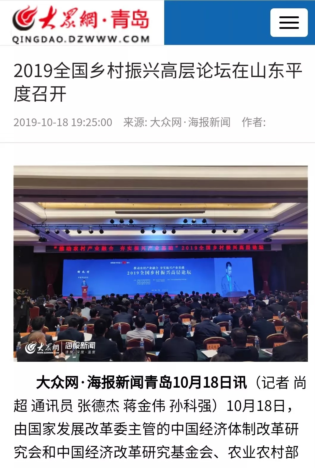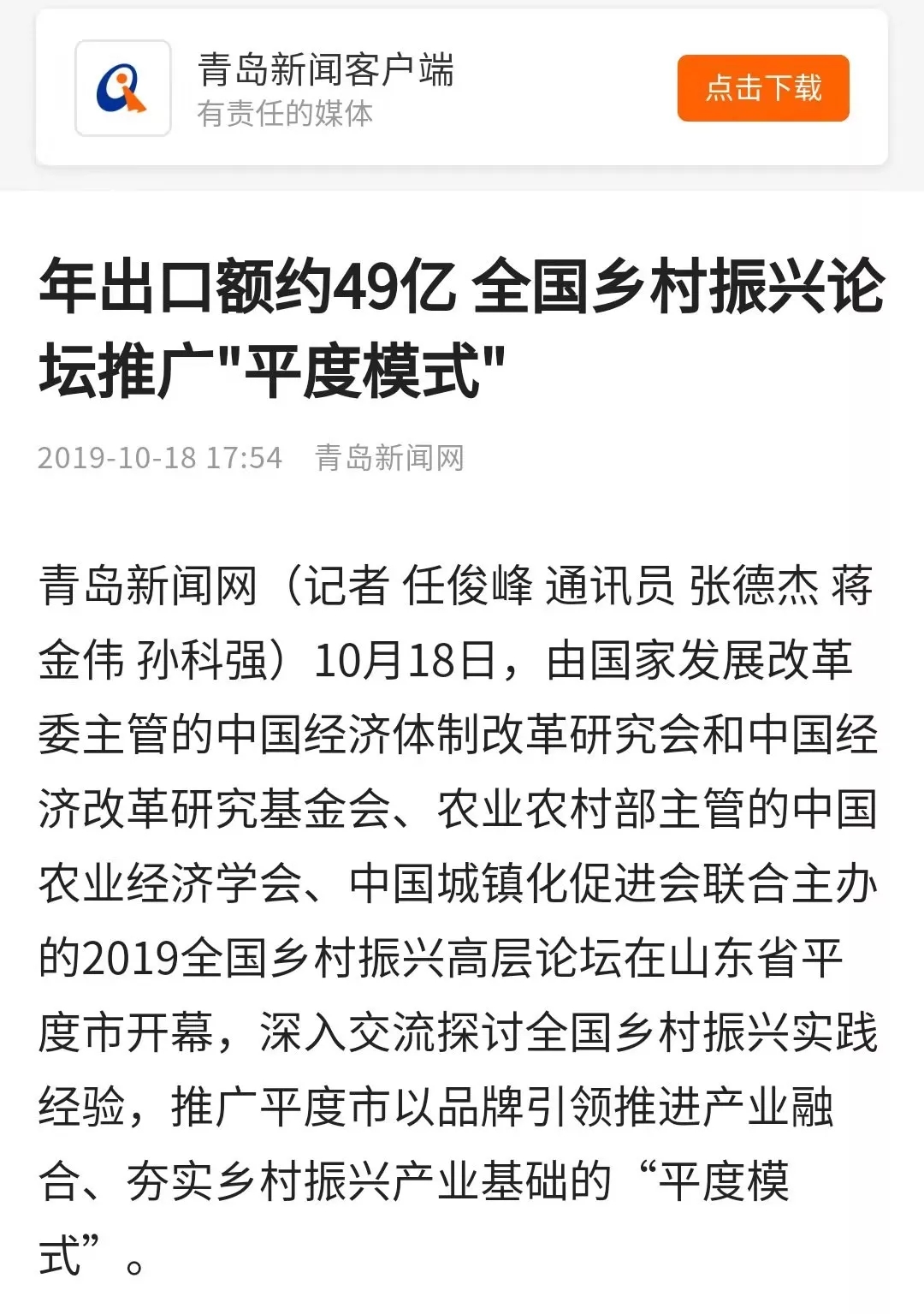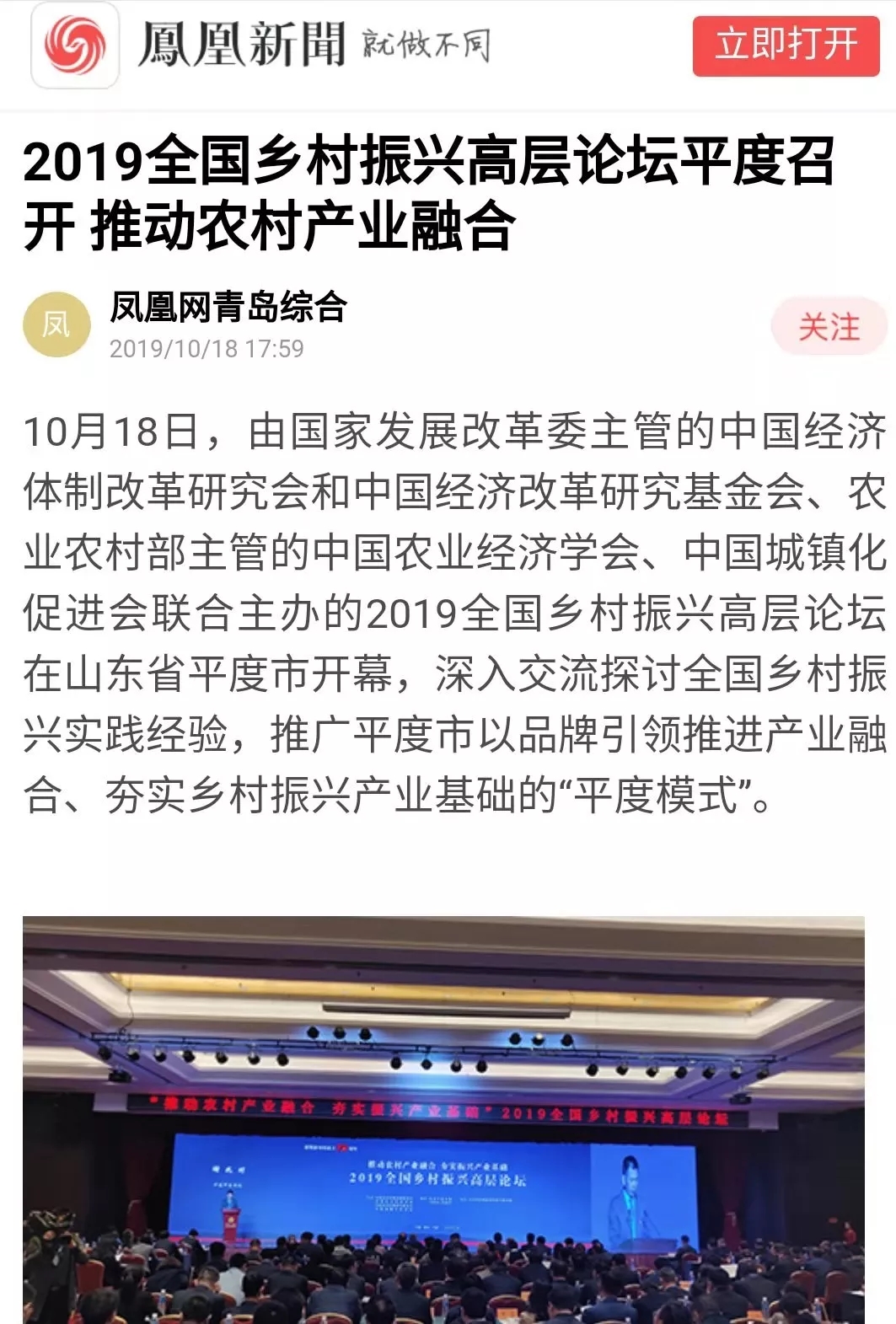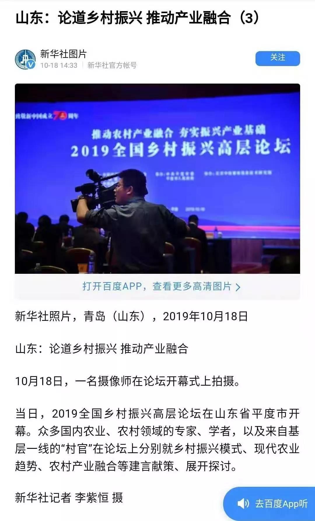 這場在平度舉行的國家級高層論壇受到各級新聞媒體聚焦關(guān)注,中央廣播電視總臺、人民日報、新華社、經(jīng)濟日報、農(nóng)民日報、中國經(jīng)濟時報、山東廣播電視臺、大眾日報、青島廣播電視臺、青島日報等20余家媒體記者到現(xiàn)場采訪報道。10月18日上午,青島廣播電視臺藍睛客戶端現(xiàn)場直播論壇盛況,在線觀看已突破7萬人次。目前,新華社、人民網(wǎng)、鳳凰網(wǎng)、青島廣播電視臺、青島日報、齊魯晚報、青島早報、青島晚報、半島都市報、商周刊、大眾網(wǎng)、中國山東網(wǎng)、青島新聞網(wǎng)等10余家媒體第一時間已刊發(fā)相關(guān)報道。