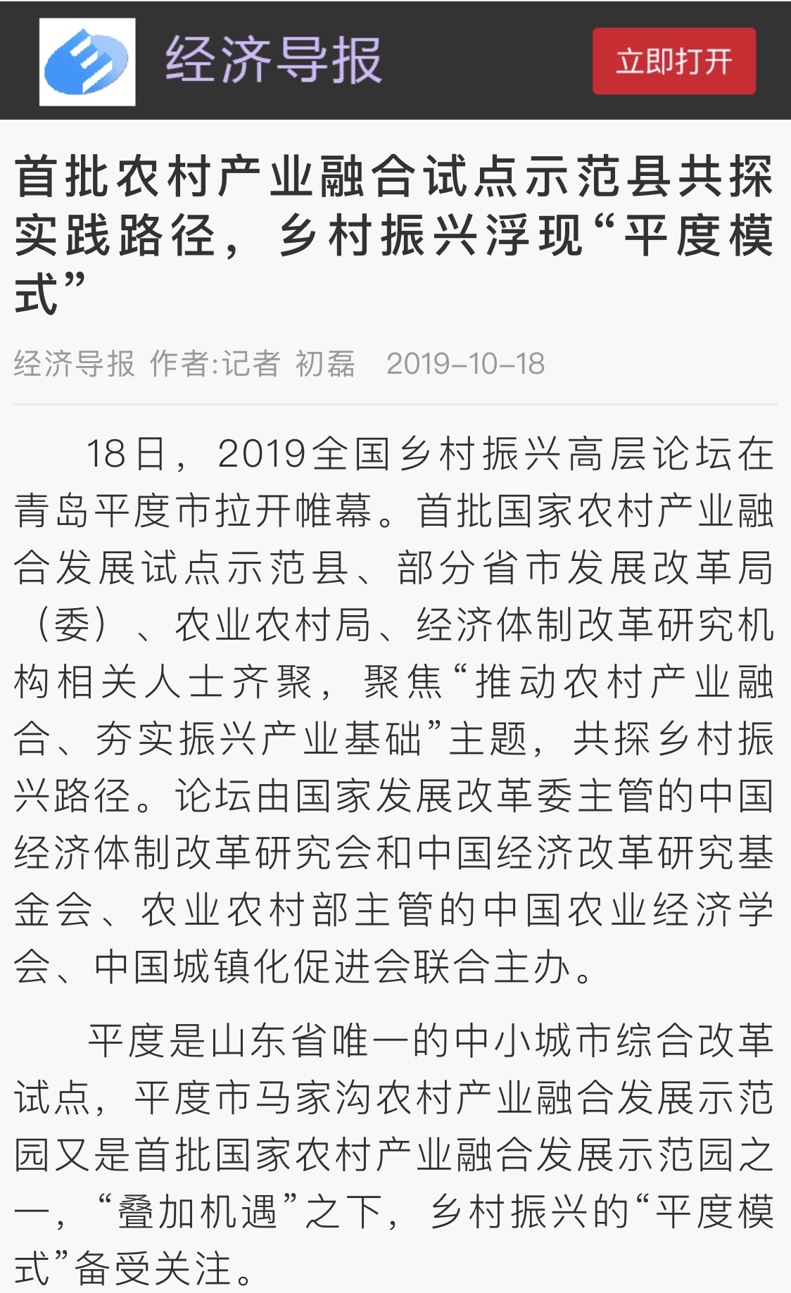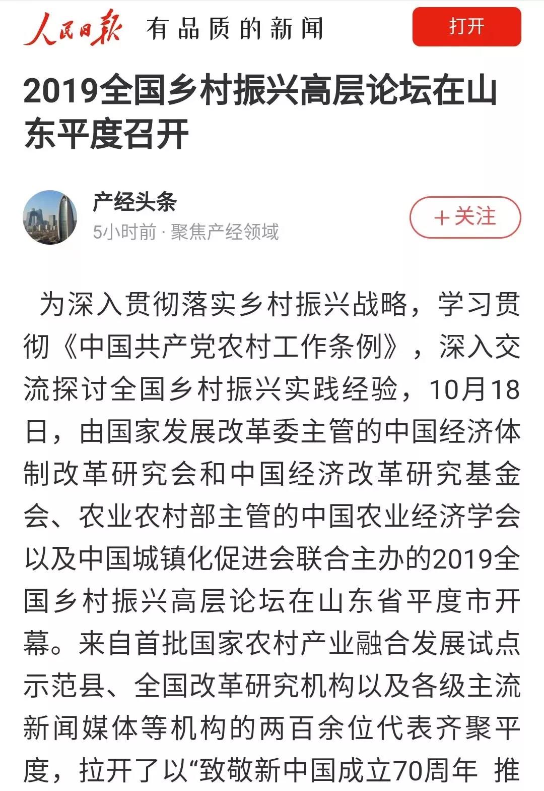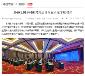 10月18日,中國經(jīng)濟體制改革研究會、中國農(nóng)業(yè)經(jīng)濟學(xué)會、中國經(jīng)濟改革研究基金會、中國城鎮(zhèn)化促進會聯(lián)合主辦的2019全國鄉(xiāng)村振興高層論壇在平度市開幕,開啟了以“推動農(nóng)村產(chǎn)業(yè)融合 夯實振興產(chǎn)業(yè)基礎(chǔ)”為主題的大討論。論壇上,中國經(jīng)濟體制改革研究會宣布把平度市列為博士后科研工作站調(diào)研基地,并授予平度“中國經(jīng)濟體制改革研究會博士后科研工作站調(diào)研基地”標(biāo)牌。